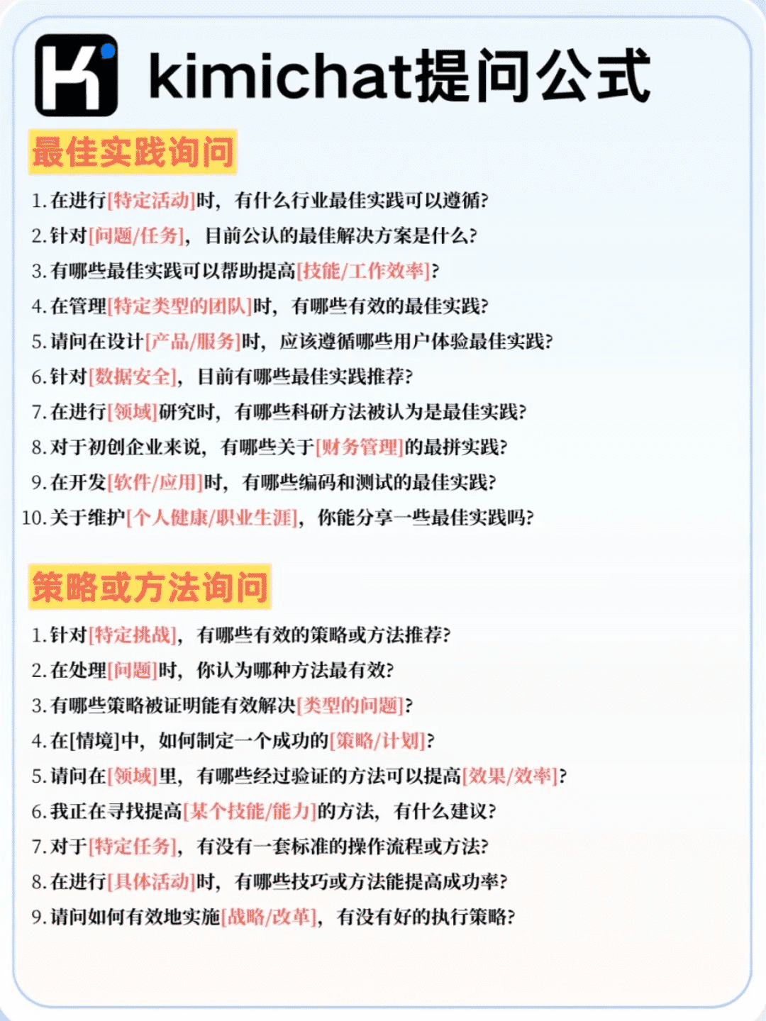 😎 질문하기 위한 효율적인 키미챗 템플릿이 여기 있습니다! 👀 이 템플릿을 마스터하여 보다 정확하고 효율적으로 질문하세요! 👍 💡 서둘러 북마크에 추가하여 원활한 커뮤니케이션을 즐겨보세요!